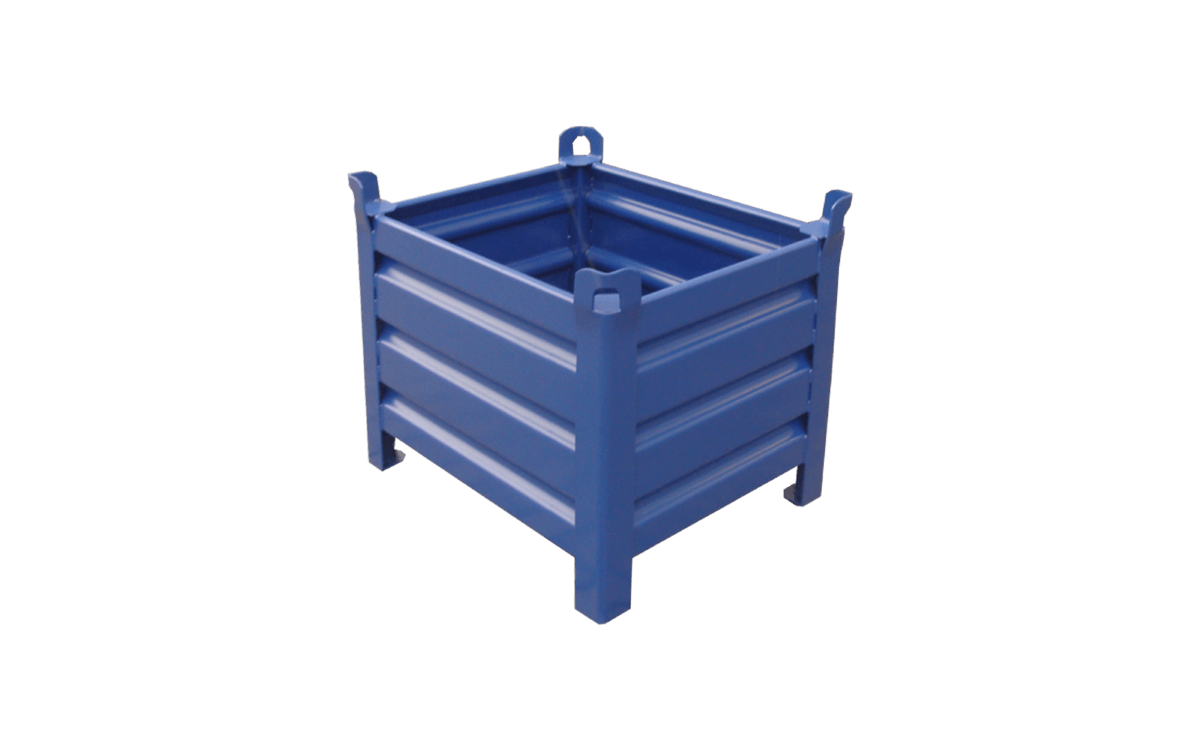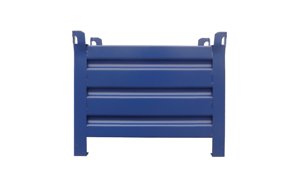 Stapelbehälter mit 4 Wänden aus stabiler verwindungsfreier Stahlkonstruktion. Die Böden und Wände sind aus profliertem und somit robustem Stahlblech gefertigt, der Rand ist verstärkt. An den Eckpfosten sind Kranösen angebracht, daher Einsatz für Gabelstapler, Stapler und Krangehänge möglich. Optional sind 2 oder 4 Gabelstapler-Einfahrtaschen möglich.