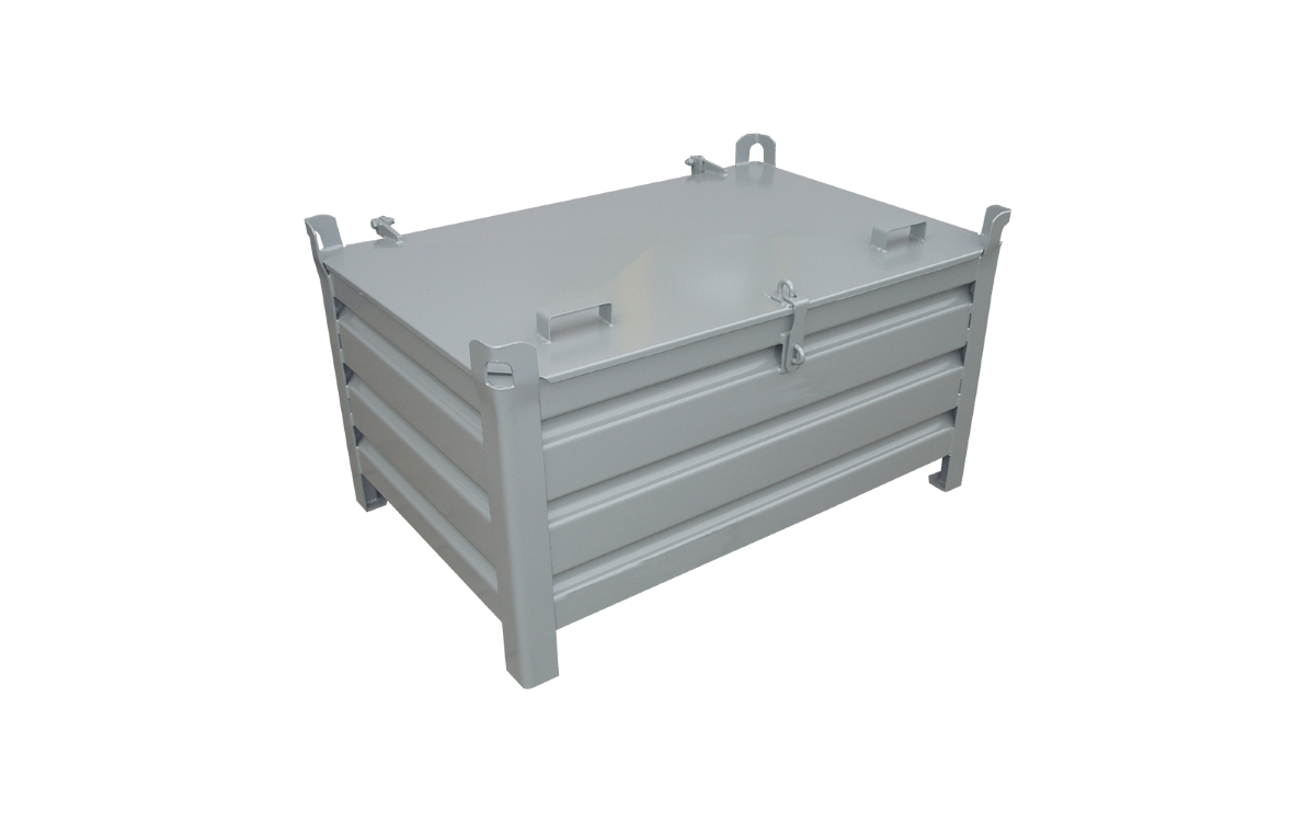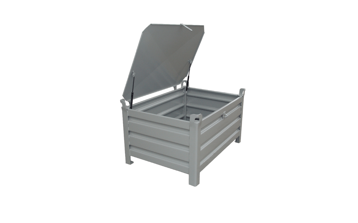 Stapelbehälter mit 4 geschlossenen Wänden aus stabiler verwindungsfreier Stahlkonstruktion mit abschließbarer Deckel. Die Böden und Wände sind aus profliertem und somit robustem Stahlblech gefertigt, der Rand ist verstärkt. Der Deckel ist mittels 2 Scharnieren sowie 2 Gasdruckfedern an der Rückwand befestigt. An der Vorderwand wird der Deckel per Vorhängeschloss (optional erhältlich) verriegelt und an der Oberseite des Deckels 2 Handgriffe zum Öffnen und Schließen. An den Eckpfosten sind Kranösen angebracht, daher Einsatz für Gabelstapler, Stapler und Krangehänge möglich. Optional sind 2 oder 4 Gabelstapler-Einfahrtaschen möglich.