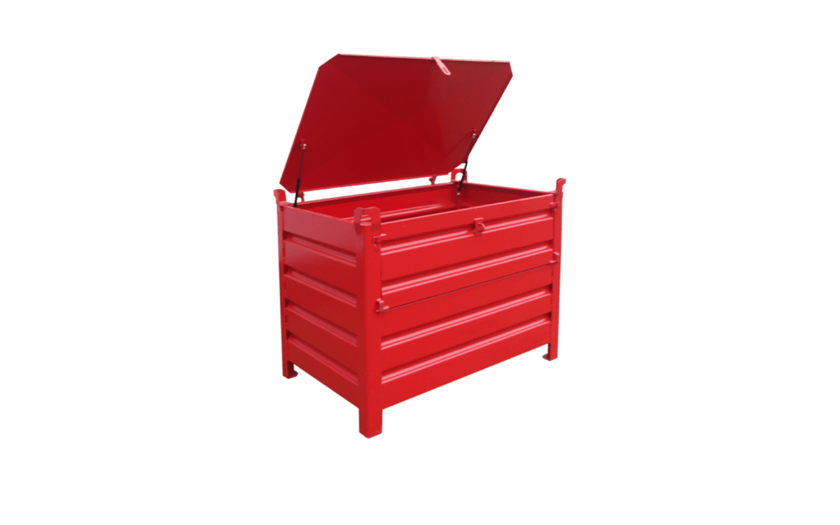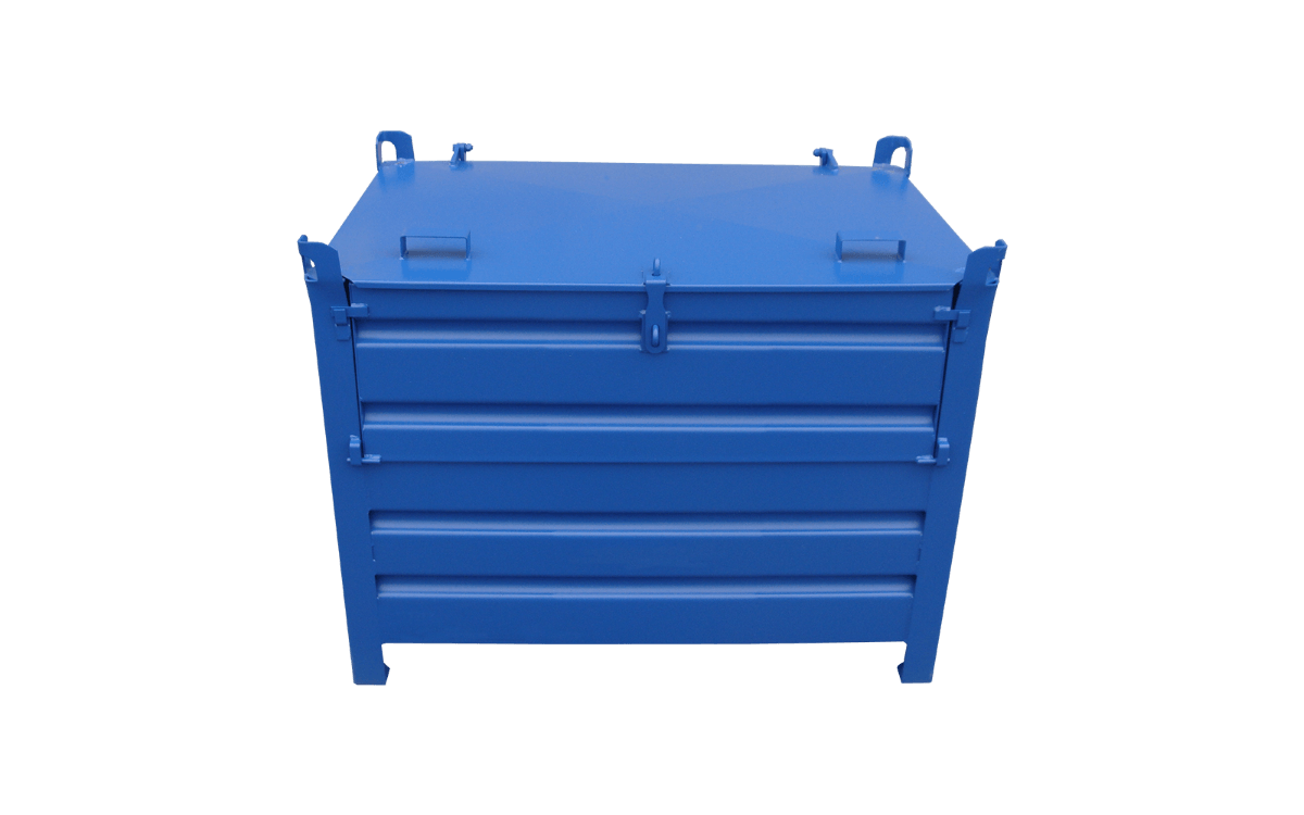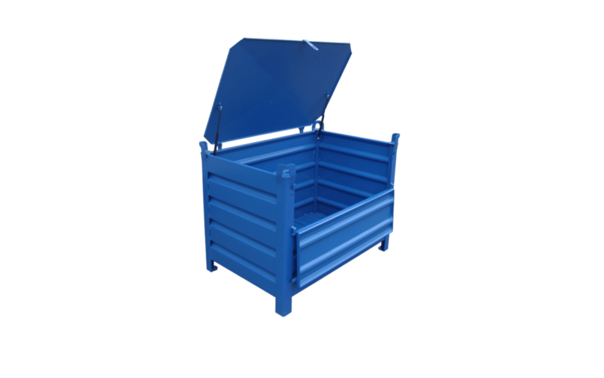 Stapelbehälter mit 4 geschlossenen Wänden aus stabiler verwindungsfreier Stahlkonstruktion mit abschließbarem Deckel und Klappe. Die Böden und Wände sind aus profliertem und somit robustem Stahlblech gefertigt. Der Deckel ist mittels 2 Scharnieren sowie 2 Gasdruckfedern an der Rückwand befestigt. An der Vorderwand wird der Deckel per Vorhängeschloss (optional erhältlich) verriegelt und an der Oberseite des Deckels 2 Handgriffe zum Öffnen und Schließen. An den Eckpfosten sind Kranösen angebracht, daher Einsatz für Gabelstapler, Stapler und Krangehänge möglich. Optional sind 2 oder 4 Gabelstapler-Einfahrtaschen möglich.
