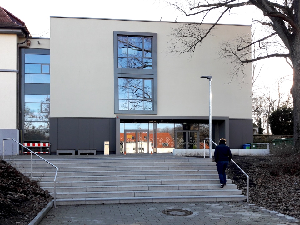 Die Erweiterung nach dem Entwurf der WOLFF GRUPPE präsentiert sich als eigenständiger Baukörper und schließt auf drei Geschossebenen an den Bestandbau an. Alle Geschosse sind über einen neu installierten Aufzug barrierefrei erschlossen. Im Erdgeschoss sind der Eingangsbereich mit Aula und Mensa angeordnet, wobei die Raumaufteilung eine flexible Nutzung ermöglicht. Die Mensa entspricht den Anforderungen der Versammlungsstättenverordnung. Daran angeschlossen befinden sich die Verteiler- und Spülküche samt Nebenräumen sowie Lager- und Technikräume.